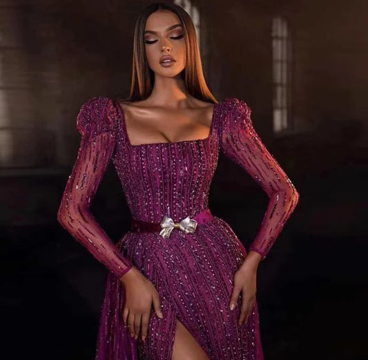 Long-sleeves straight Full-length Dress With a Square neckline and Stone Embellishments
